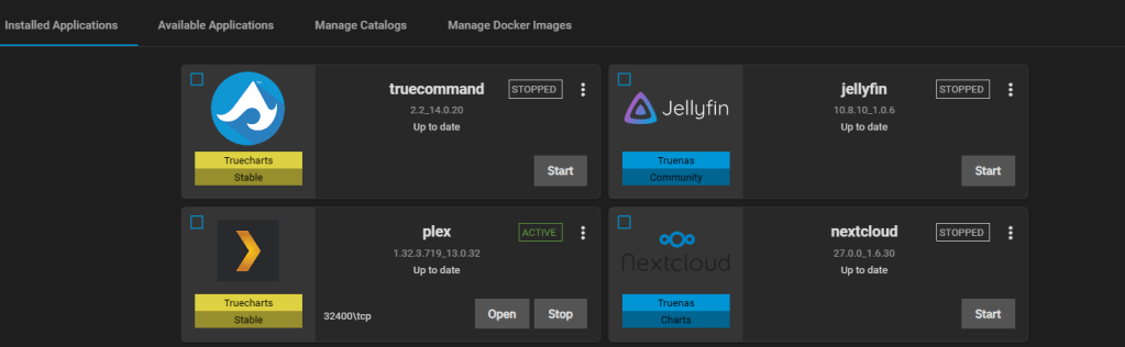 For Apps, I’m using 2 catalogues, Truenas’ own and Truecharts. From TrueCharts’ catalogue, I have installed Plex for all my media, which my family can access, which my kids love having and Truecommand as my mom has expressed an interest in having her storage server in the future and I need to be able to keep an eye on her machine without setting up a VPN to her house.